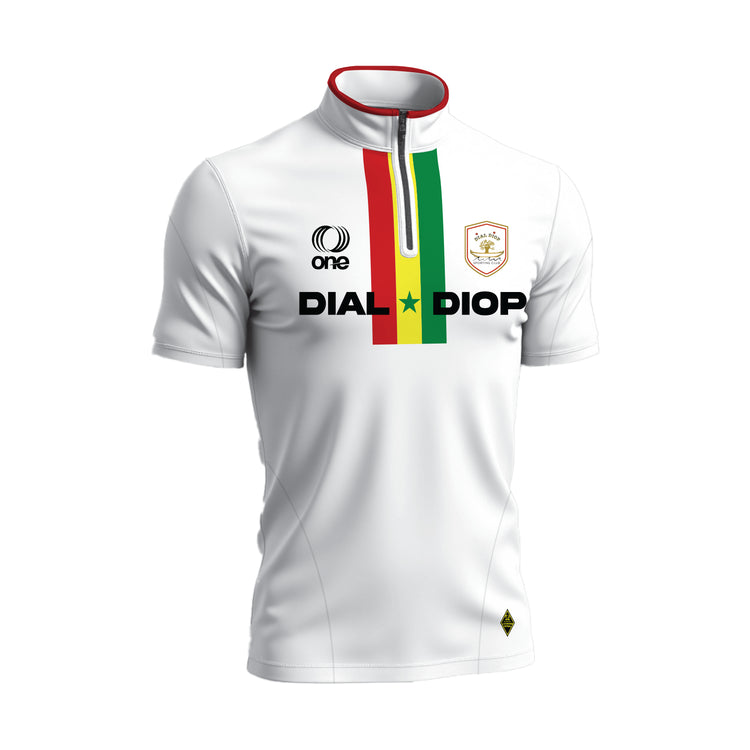Embody the spirit of Senegal and the relentless drive of Dial Diop FC in this sleek Dial Diop FC White Midlayer, engineered for peak performance on the turf and styled for maximum club pride off it. The bold vertical stripe of green‑yellow‑red emblazoned down the chest mirrors the Senegalese flag and culminates in a single star, your emblem of unity and ambition.
